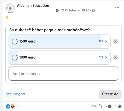 AlbanianEducation.net që merret ekskluzivisht me arsim ka realizuar një anketë me lexuesit e saj ku i ka pyetur: Sa duhet të bëhet paga e mësimdhënësve: 1 mijë apo 1500 euro?