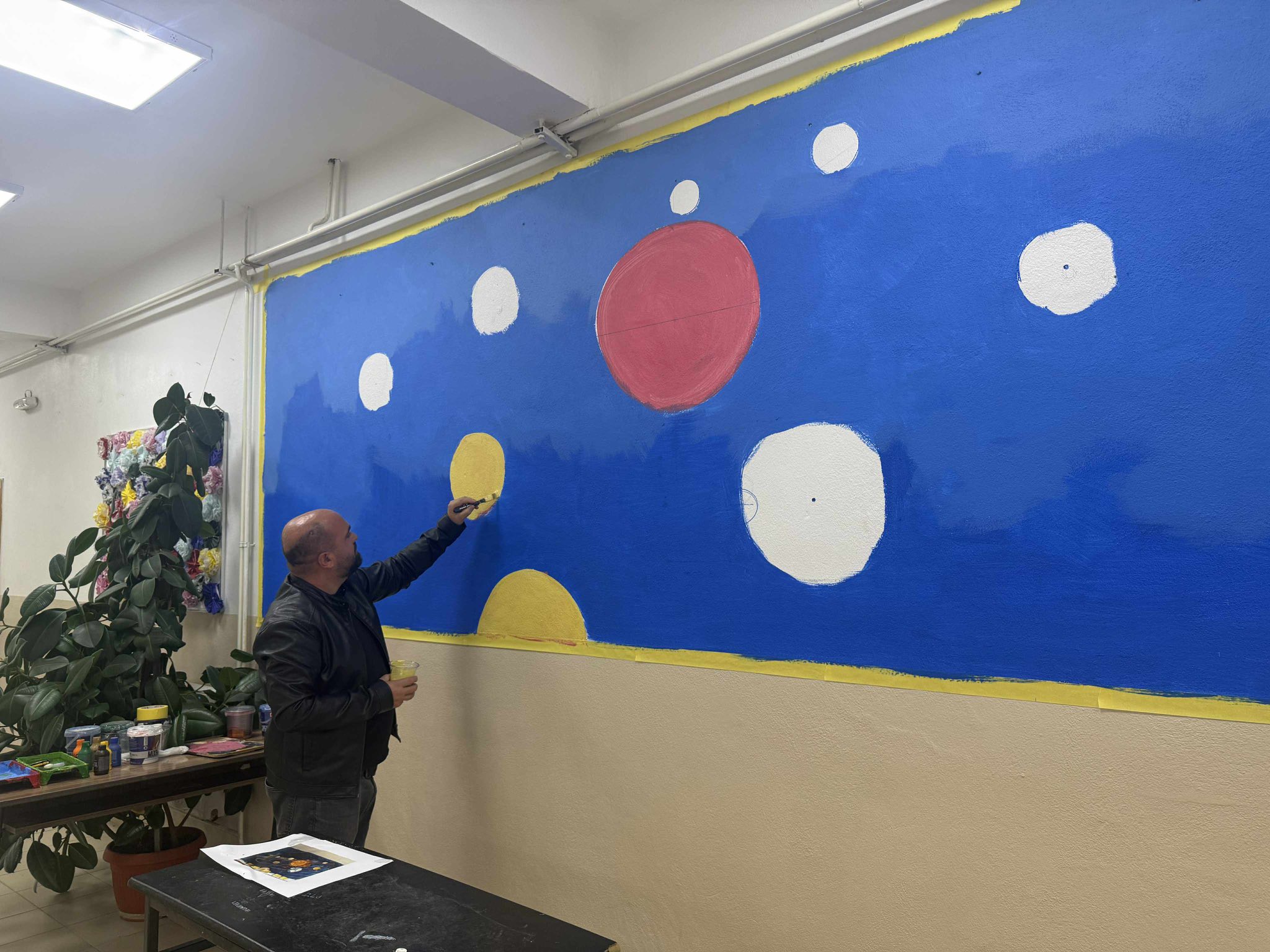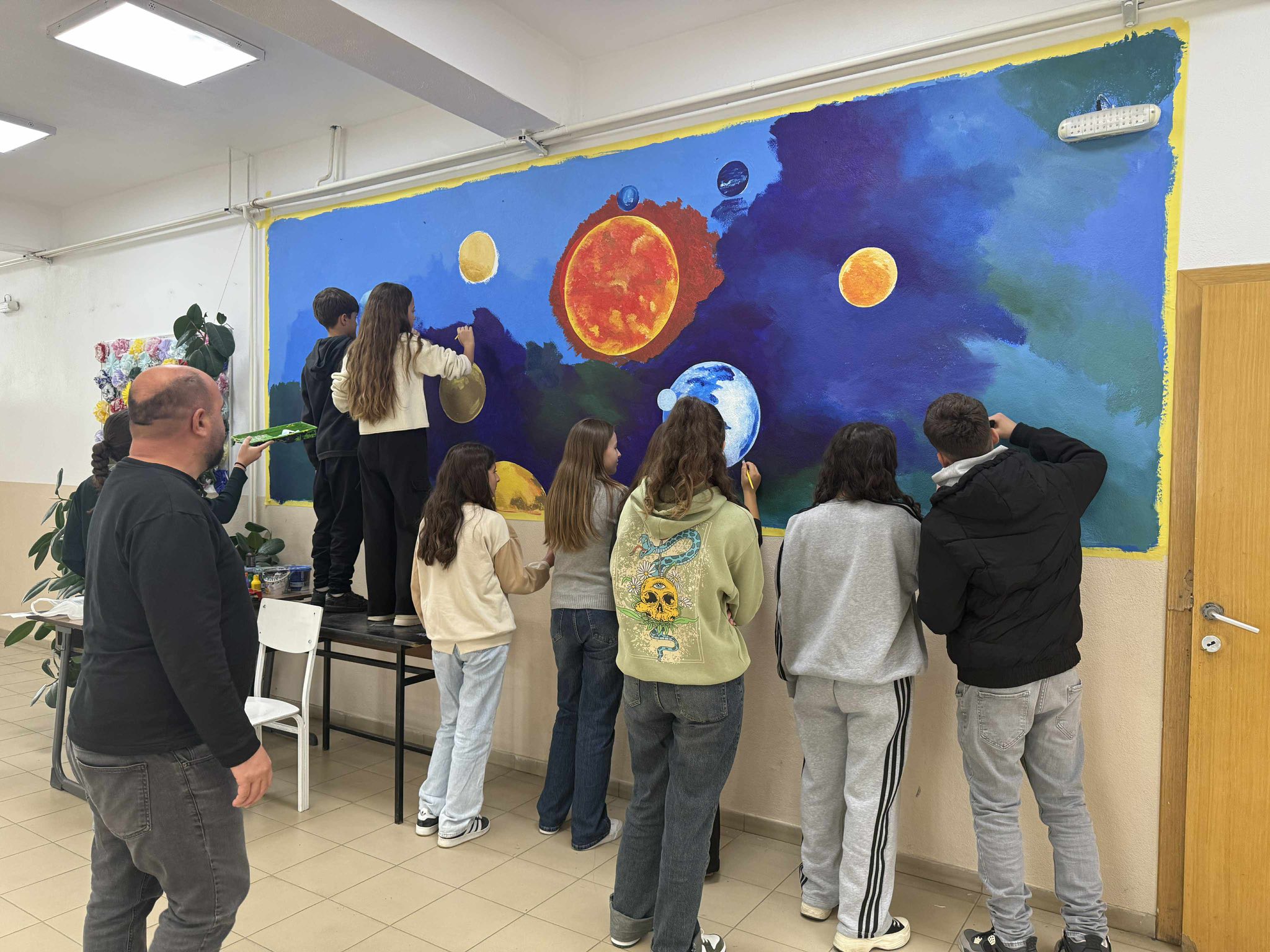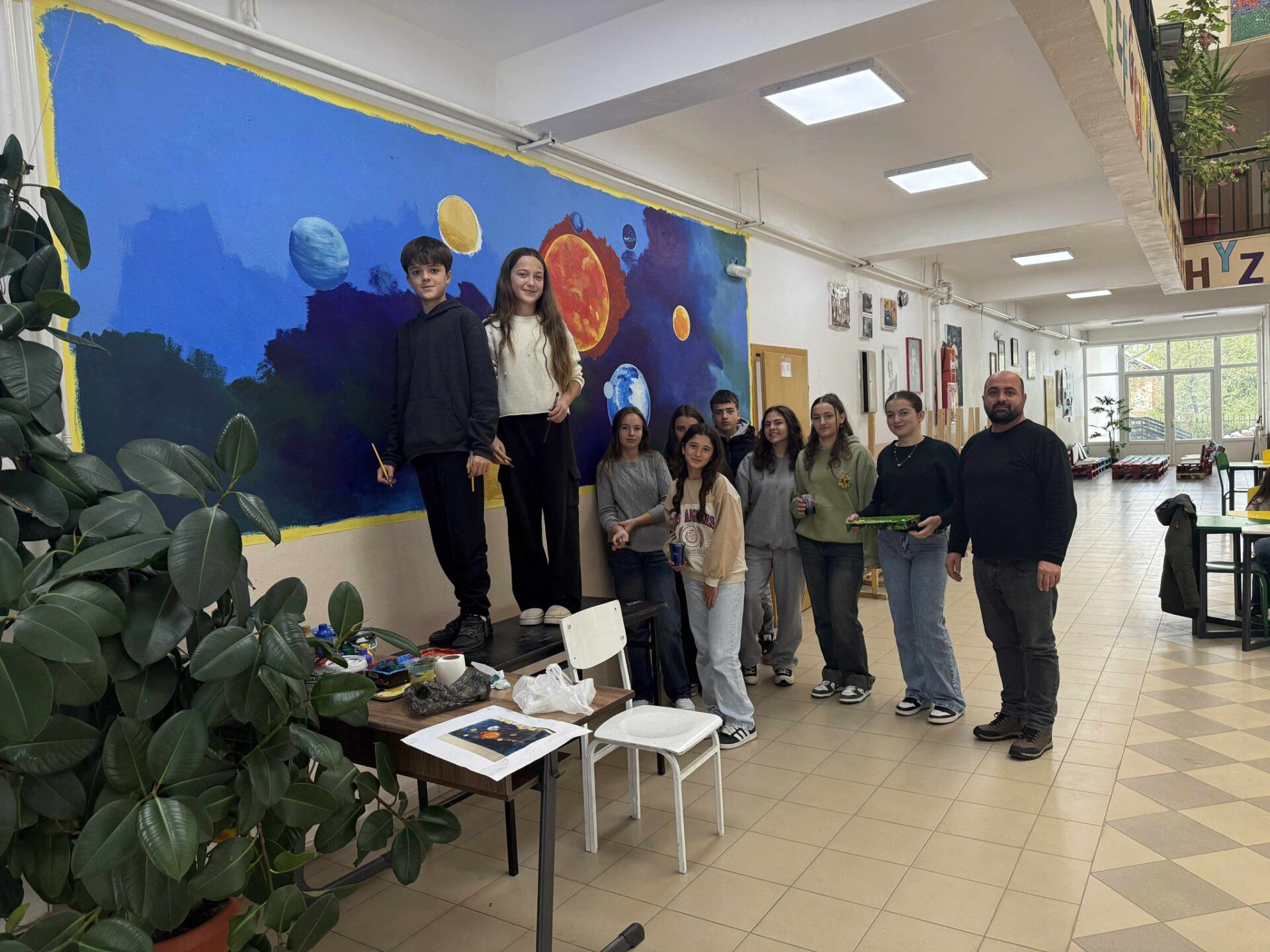 Nën udhëheqjen e tij, ata kanë realizuar një punim artistik mbresëlënës – një mural që paraqet sistemin diellor me ngjyra të gjalla, forma harmonike dhe detaje të punuara me kujdes.