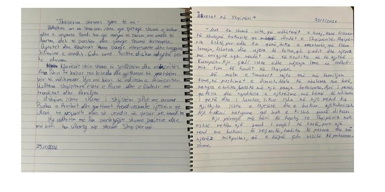 Në kuadër të këtij procesi mësimor, nxënësit janë nxitur të shprehin përmes eseve përjetimet e tyre personale gjatë vizitave në Shqipëri. Sot, ndajmë me kënaqësi dy nga këto krijime, të cilat vijnë si dëshmi e një pune të përkushtuar mësimore dhe e dashurisë së fëmijëve për gjuhën dhe vendin e tyre.