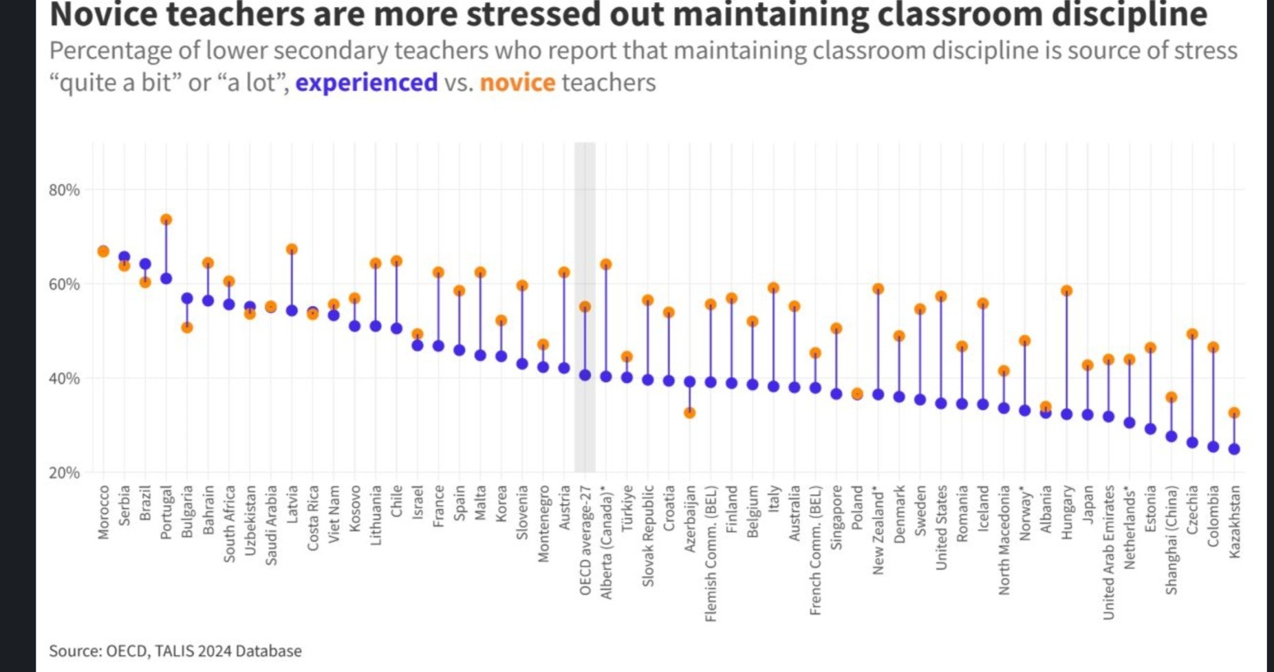 Grafiku mat përqindjen e mësuesve të arsimit të mesëm të ulët që raportojnë se ruajtja e disiplinës në klasë është burim stresi. Në pothuajse çdo vend të anketuar, mësuesit fillestarë (pikat portokalli) raportojnë një nivel më të lartë stresi për ruajtjen e disiplinës sesa mësuesit me përvojë (pikat blu).