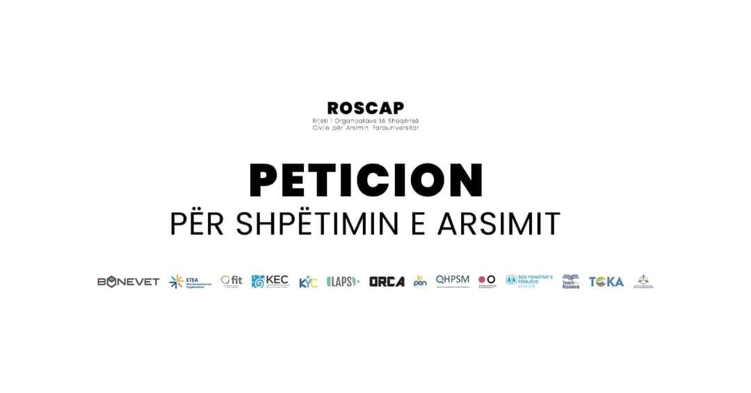 Rrjeti i Organizatave i Shoqërisë Civile për Arsimin Parauniversitar (RrOShCAP) po i fton qytetarët të marrin pjesë në ceremoninë e fillimit të nënshkrimit të peticionit për shpëtimin e arsimit, më 7 mars, nga ora 10:00, para Kuvendit të Kosovës.
