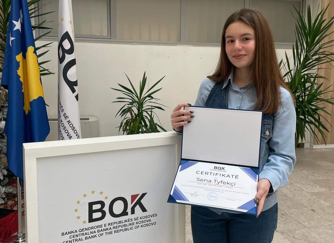 Nxënësja e Gjimnazi “Gjon Buzuku” – Prizren Sena Tyfekçi, Xl/2, ka shkëlqyer duke fituar vendin e tretë në garën e organizuar nga Banka Qendrore e Kosovës në kuadër të edukimit financiar.