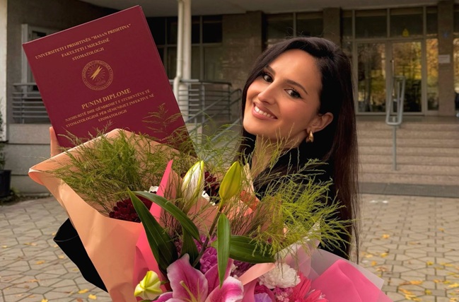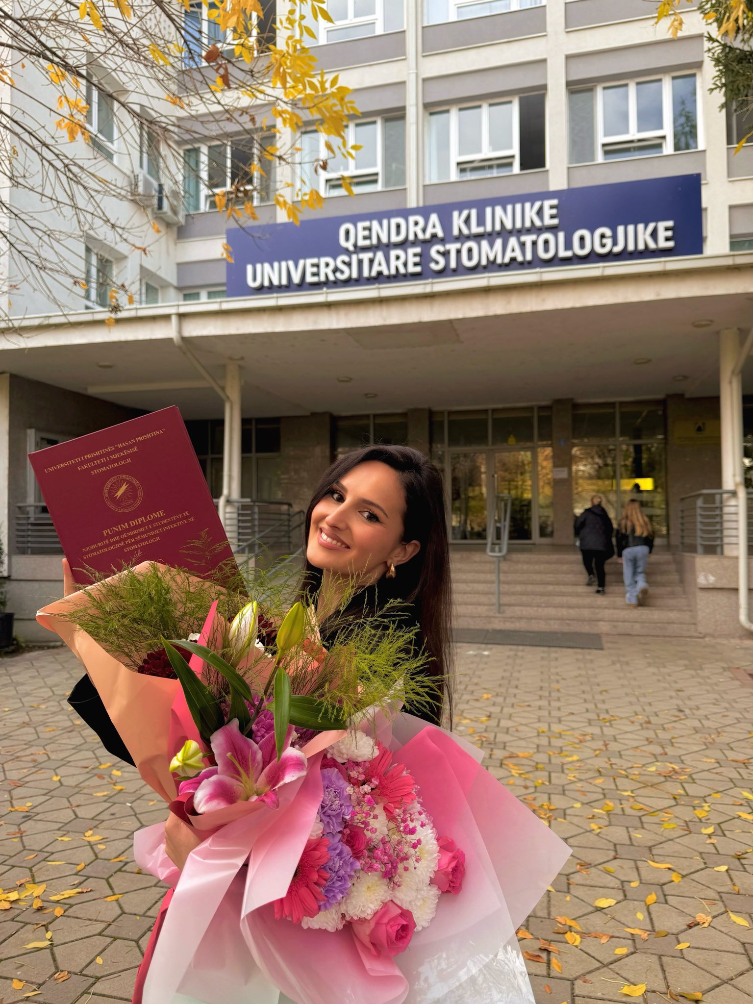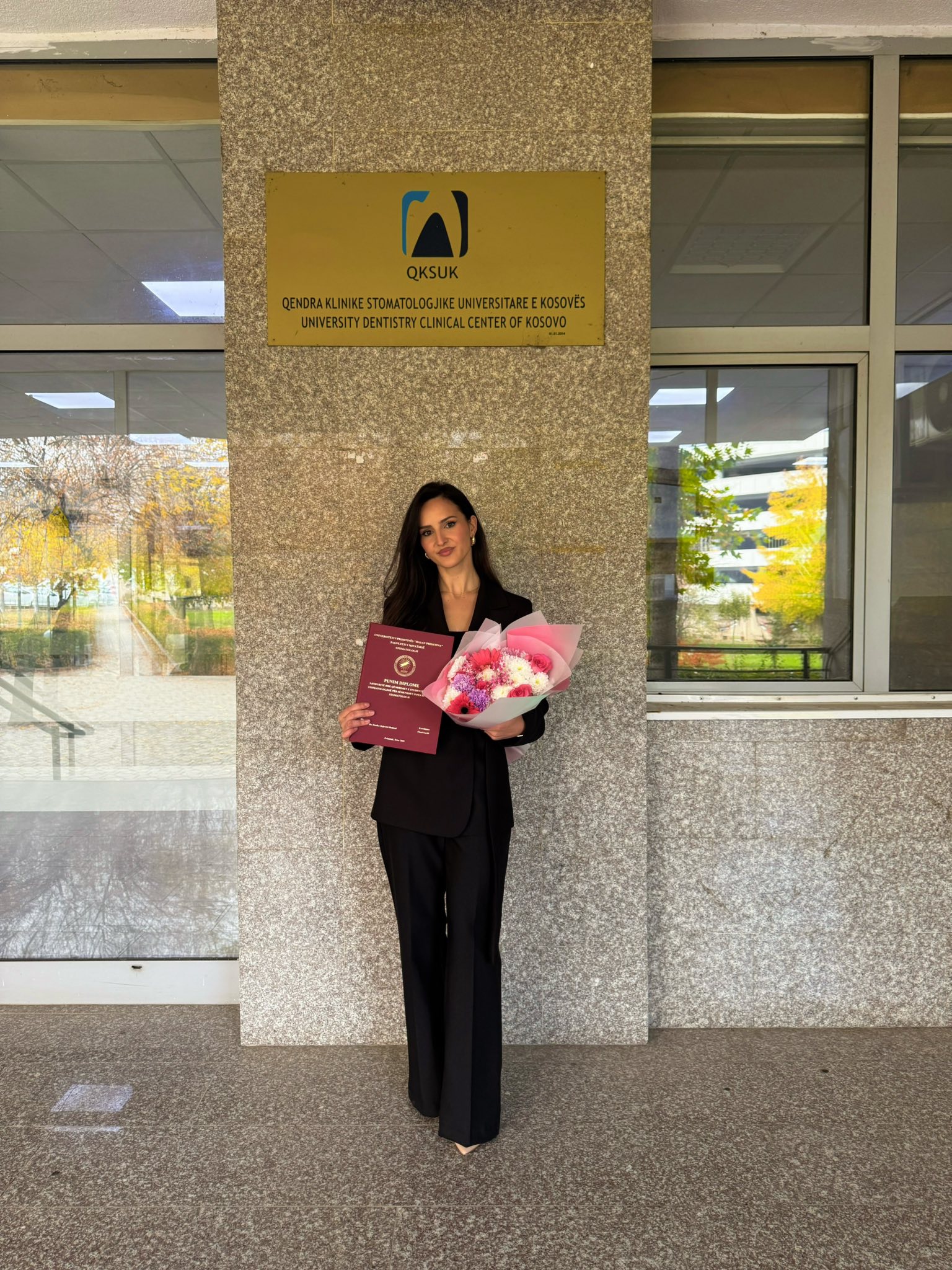 Studentja Elonë Gashi ka arritur një nga momentet më të rëndësishme në rrugëtimin e saj akademik dhe profesional, duke mbrojtur me sukses temën e diplomës dhe duke u diplomuar si Doktoreshë e Stomatologjisë.