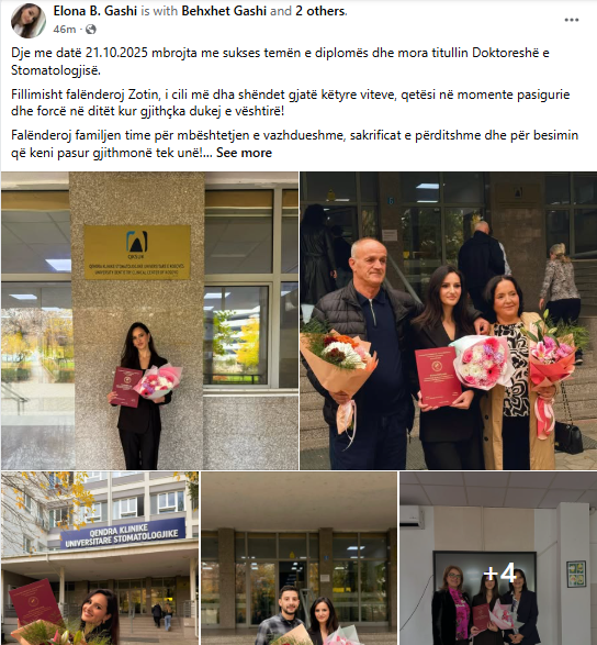 “Këtë arritje ia dedikoj prindërve të mi,” shkruan Dr. Gashi me emocion, duke reflektuar mirënjohjen për rrënjët dhe mbështetjen e pakushtëzuar familjare.