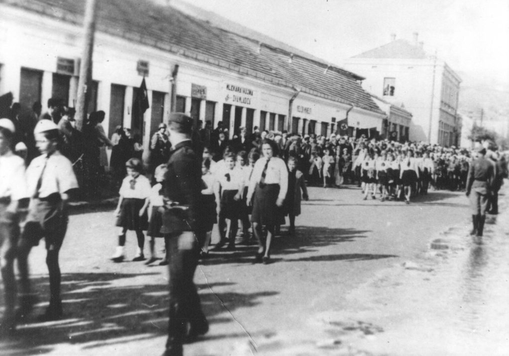 Në foto shihen ushtarër shqiptarë së basku me ushtarët italianë dhe gjermanë duke mbajtur flamurin shqiptar dhe nazist në Pazarin e Ri, në vitin 1941.